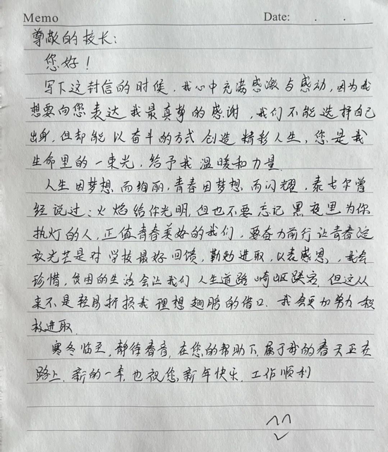 周一清晨,陽(yáng)光如往常一樣灑進(jìn)永康市職業(yè)技術(shù)學(xué)校校長(zhǎng)室。在辦公桌上,靜靜地躺著兩封信。信中的文字如潺潺暖流:“您的到來(lái),如同春日暖陽(yáng),照亮我心田。我會(huì)銘記教誨,努力學(xué)習(xí),不辜負(fù)學(xué)校的期望。”寥寥數(shù)語(yǔ),卻是兩顆被愛(ài)與溫暖照亮的心靈,向教育者的無(wú)私奉獻(xiàn)發(fā)出的最誠(chéng)摯、最高的贊譽(yù)!
