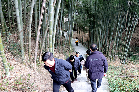 基層學校走訪調研結束后,大家來到位于夏履鎮雙葉村海拔400余米的葉家山腳下。大家相互鼓勁,穿過幽靜竹林,登上1046步臺階,來到被譽為夏履十二景之一“山隱桃源”的葉家山古村落。徜徉在古村落八百年悠久歷史之中,千年古柏在美麗冬景的映襯下顯得更加蒼老,仿佛向大家敘說著古村落這段不朽古老傳說。