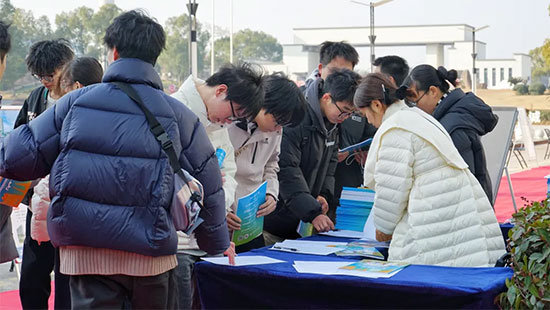 在鋪著紅地毯的道路兩側,擺放著江山市優質企業的宣傳展板。畢業生們一踏入校園,便被這熱烈的氣氛所吸引,紛紛駐足觀看,翻閱由江山市人社局精心印制的企業用工手冊,尋找自己心儀的崗位。