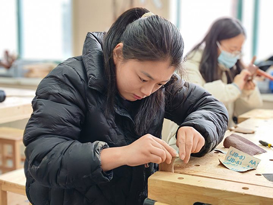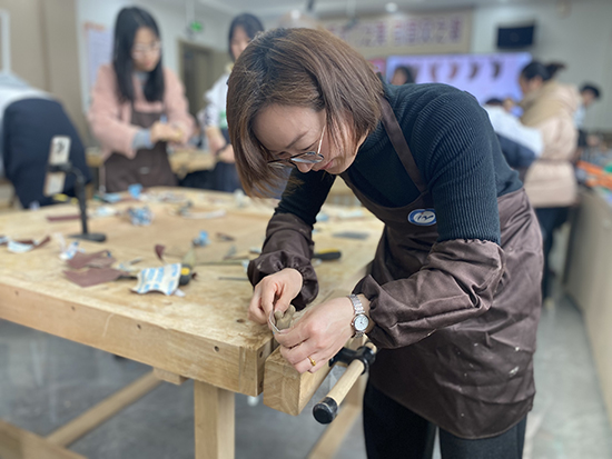 在木工坊內,女教職工們熱情高漲,全身心投入到手工制作中?;顒右潦?,木工專業的老師和學生們為她們講解了制作按摩梳的步驟和要點。隨后,大家便開始了精心的創作。首先,她們拿起戳刀,小心翼翼地將木梳的棱角磨平,確保每一個細節都處理得恰到好處。接著,用砂紙進行反復打磨,使木梳表面變得光滑細膩。最后,為木梳上蠟,增添光澤與質感,一把把精美的按摩梳在她們的巧手中逐漸成型。