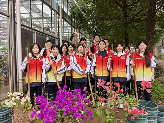 活動現場,身著紅馬甲的志愿者們分工協作,揮鍬鏟土、扶苗培土、提水澆灌,在園林專業教師指導下種植了20余株三角梅和紫背竹芋。熱烈奔放的三角梅與葉片斑斕的紫背竹芋相互映襯,為場館外立面勾勒出生機盎然的生態景觀帶。