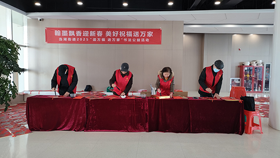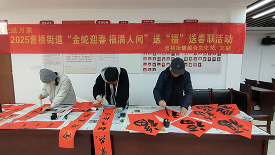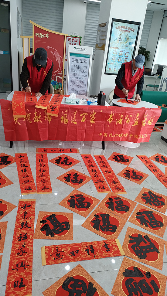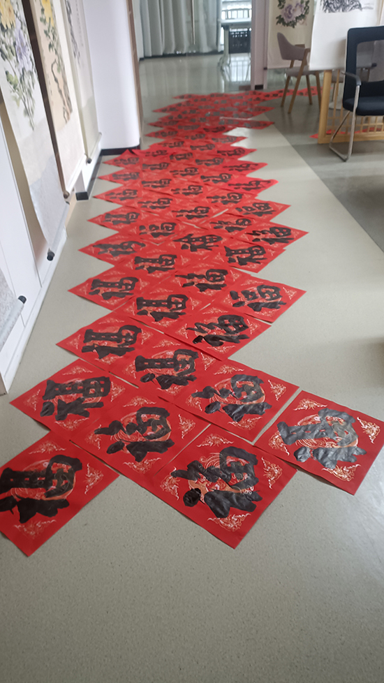 書法班龔國銘老師帶領鐘志鴻、何鑫華等學員在新春佳節即將來臨之際,先后參加機關、團體、街道、社區、學校、銀行、村莊、企業等送春聯、送福字、送溫暖活動。據不完全統計,參與場次50多場,寫春聯3000多對、福字6000多個、年歷軸220軸,為市民朋友送去了濃濃的年味和新年的祝福,也營造了歡樂祥和的節日氛圍。