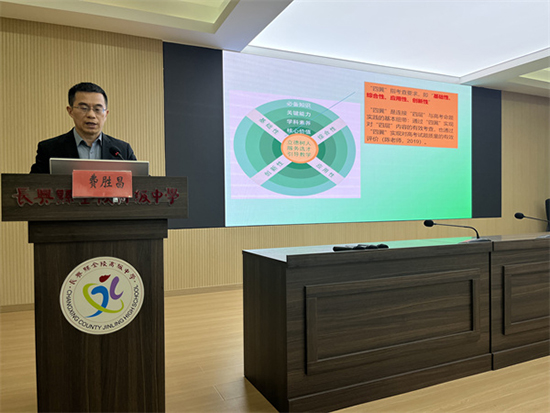 正高級教師、省特級教師費勝昌老師就“新高考命題主要特點及趨勢”這一話題深入剖析。他從命題的依據(jù)、命題的邏輯、命題的原則及考查的基本能力等方面闡述了新高考背景下高中英語命題的思路和方法。同時,他要求老師們在課堂中要善于利用學生的錯誤轉(zhuǎn)化成課堂高效——看得見思維生長的課堂,為高三復習課轉(zhuǎn)型提出更高要求。