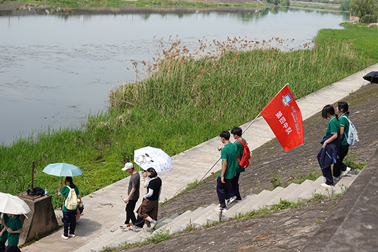 學生們沿著浦陽江游步道前行,隊伍如同一條躍動的長龍,沿途不僅欣賞了美麗的春景,還積極參與環保行動,青益啟志愿者團隊的“環保小分隊”隨手撿拾垃圾,體現了文明出行的理念。