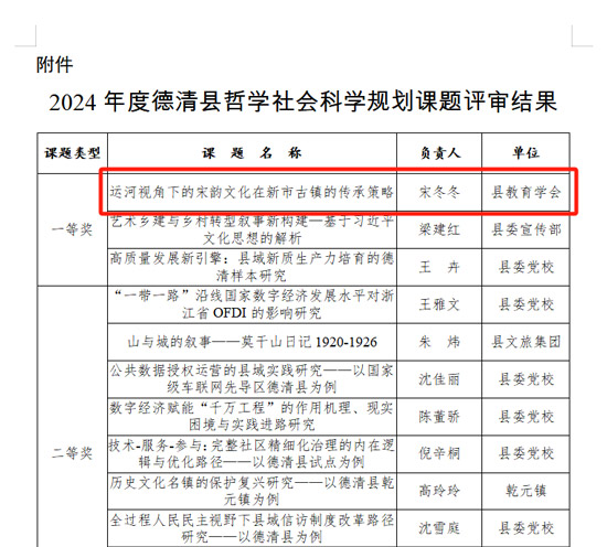 近日,德清縣社會科學界聯(lián)合會公布2024年度社科課題評審結果。德清職業(yè)中專宋冬冬老師主持的課題《運河視角下的宋韻文化在新市古鎮(zhèn)的傳承策略》榮獲全縣一等獎(第一名)。