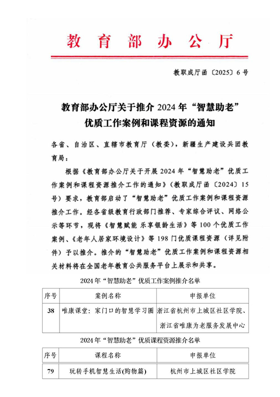 近日,教育部公布2024年“智慧助老”優質工作案例和課程資源推介名單,共評選出100個優質工作案例和198門優質課程資源。其中,浙江省有6個案例和13門課程入選,上城1個案例1門課程榜上有名。杭州市上城區社區學院與浙江省唯康為老服務中心聯合打造的《唯康課堂:家門口的智慧學習圈》入選優質工作案例,杭州市上城區社區學院的《玩轉手機 智慧生活(購物篇)》入選優質課程資源。