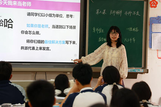夏李蕊老師的《良師相伴 亦師亦友》一課基于真實(shí)情境展開,以模仿老師上課的動(dòng)作相結(jié)合的多模態(tài)展現(xiàn),將思政知識(shí)直觀化、豐富化,激發(fā)孩子思政學(xué)習(xí)興趣的同時(shí)幫助孩子理解老師,尊重老師。夏老師通過邏輯清晰、層層遞進(jìn)的活動(dòng)鏈,不斷激發(fā)學(xué)生的思維。在猜一猜、演一演等教學(xué)活動(dòng)中,逐步培養(yǎng)起學(xué)生的共情能力,學(xué)會(huì)相互尊重。