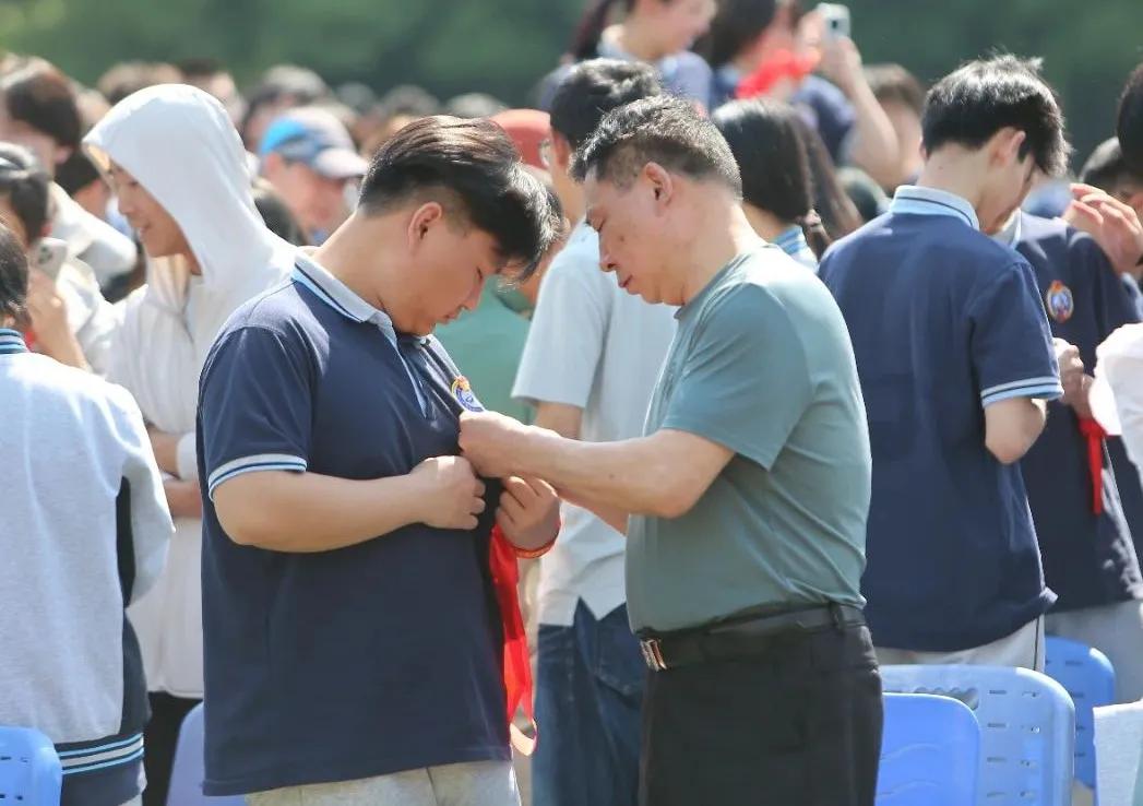 金萍女士代表家長發言。她祝福技師青年揚帆起航,滿載而歸。家長們親手為孩子佩戴上成人徽章、系上祝福絲巾小小的物件,裝滿了沉甸甸的愛與期望。學生捧出親手制作的感恩賀卡,用文字表達對父母的感激,同時向家長和老師道一聲“爸爸媽媽,我愛您!老師,我愛您!”并深情擁抱。在這一刻,所有人的情緒進行釋放,淚灑現場。