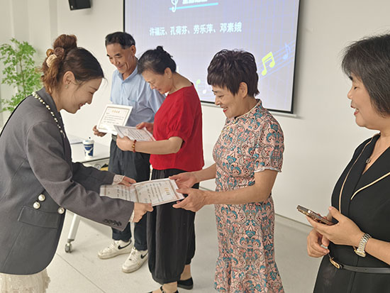 學(xué)員展示環(huán)節(jié)將活動(dòng)推向了高潮。學(xué)員們紛紛走上舞臺(tái),自信地展現(xiàn)自我。有的學(xué)員演唱了自己喜愛(ài)、擅長(zhǎng)的曲目,將歌曲中的情感表達(dá)得淋漓盡致;有的學(xué)員展示了課上學(xué)過(guò)的歌曲,用歌聲表現(xiàn)對(duì)課堂的喜愛(ài)和不舍。他們的歌聲傳遞著對(duì)生活的熱愛(ài)、對(duì)社區(qū)滿滿的歸屬感。臺(tái)下的觀眾們也被他們的精彩表演所感染,不時(shí)爆發(fā)出熱烈的掌聲和歡呼聲。
