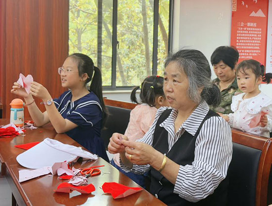 學(xué)校借助“剪紙、盤紙”等非遺文化,為“一老一小”代際共融搭建橋梁。在黃泥嶺雙擁社區(qū),祖孫搭檔手持紅紙、銀剪翻飛,將“孝”“廉”“賢”等好家風(fēng)元素融入剪紙創(chuàng)作過程中,共品清廉家風(fēng);在巖后村,立足當(dāng)?shù)靥禺a(chǎn)“枇杷”開展盤紙活動(dòng),祖孫在創(chuàng)作中共述優(yōu)良家風(fēng)、鄉(xiāng)風(fēng)。孫輩在非遺體驗(yàn)中觸摸文化根脈,祖輩在技藝傳授時(shí)傳遞處世智慧,清廉家風(fēng)隨著活動(dòng)開展浸潤(rùn)萬(wàn)家。