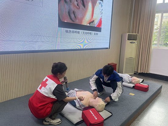 為增強學生安全意識,普及急救知識,提高應對突發狀況的能力,6月9日下午,杭州市喬司職業高級中學開展了一場以“氣道異物梗阻心肺復蘇(CPR)+AED使用”為主題的應急救護知識講座,浙江省紅十字二級講師、國家應急救援員、杭州龍晟應急救援服務中心師資組組長蔡海燕為該校高一、高二年級部分學生代表進行了應急救護常識指導培訓。