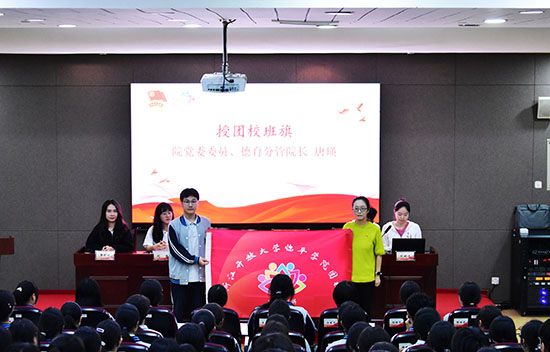 院黨委委員、德育分管院長唐瑛同志向本期團校學員代表——2412藝術設計班的溫志鵬同學授予了本期團校班旗。徽章與旗幟的傳遞,寓意著組織信任的交付和奮進力量的凝聚,激勵學員們在班旗引領下團結協作、銳意進取。