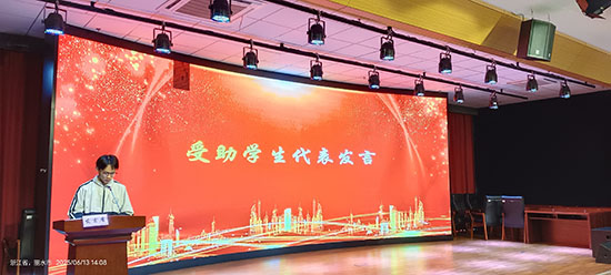 23電子班的楊康同學作為受助學生代表發言。他衷心感謝亞德客國際集團的捐助,并作出承諾:一定會合理使用資助金,將每一分錢都用在學習與生活的刀刃上;同時會以更高的標準要求自己,尊師守紀、刻苦鉆研、積極進取,用優異的成績回報大家。他號召全體受資助同學,將來要將善意傳遞下去,去幫助更多需要幫助的人,讓溫暖與希望不斷延續。