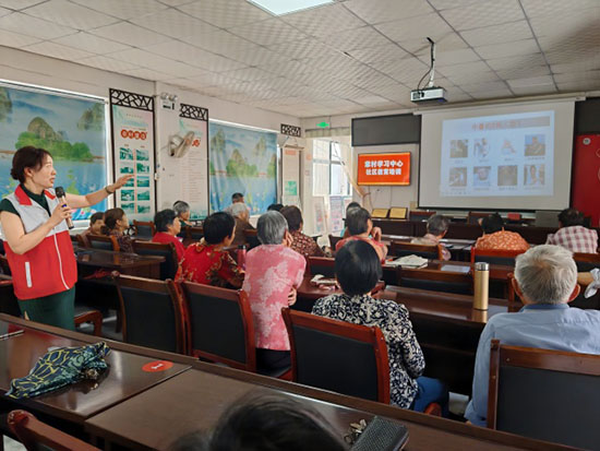 在急救技能培訓環節,鄭醫生現場演示了中暑急救的規范操作,包括將患者轉移到陰涼通風處、解開衣物散熱、用濕毛巾擦拭身體等步驟,并邀請老人們上臺進行實際操作練習。老人們積極參與,認真學習每一個動作,現場氣氛熱烈。