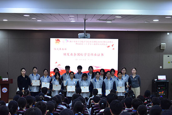 校團委委員駱舒婕老師、團委干事劉栩吟老師為業余團校2024期學員代表頒發結業證書,并合影留念。