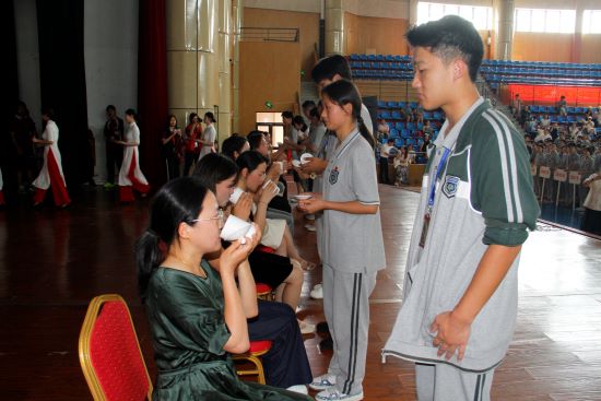 在主持人熱情洋溢的開場白中,成人禮正式拉開帷幕。校黨委書記劉忠明莊嚴宣布:“杭州市富陽區職業教育中心2023級學生成人儀式正式開始!” 這一刻,標志著屬于2023級學子的神圣時刻到來!莊嚴優美的《圣潔的時刻》旋律奏響!全體高二學子,意氣風發,邁著堅定的步伐,昂首闊步,跨越象征責任與擔當的成人門!儀式進入核心環節——冠禮儀式。校領導及各專業部領導依次為各班學生代表佩戴象征責任與使命的成人帽,頒發賦予公民權利的《中華人民共和國憲法》讀本,以及代表學校對學生專業素養與職業精神高度認可的“第一技能”證書。站在成人的門檻上,23美文王懷彬同學代表全體同學訴說了激動的心聲與成長的感悟。隨后,在23服化華璐陽同學的帶領下,全體同學面對國旗,高舉右拳,以青春的名義許下莊嚴的成人誓言。接著,學生代表們向自己的父母敬獻感恩茶。謝師恩:效仿古禮,同學們以“束脩之禮”向敬愛的班主任老師們表達最誠摯的感恩。各專業部學生代表上臺,向班主任老師行禮獻禮。班主任代表、23醫1班史英娜老師為同學們送上了飽含深情的成人寄語。接著,各班學生代表將班旗鄭重交還給學校珍藏。敬愛的夏峰巍校長為全體同學送上了成人禮的祝福與殷切期望,語重心長的囑托必將化為同學們前行的不竭動力。