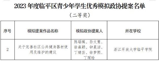 2023年浙江開放大學臨平學院學生校外成長導師、區政協委員金丹文和思政教師朱曉燕組成“雙導師”,共同指導學生參加模擬政協提案活動。通過實地走訪、問卷調查、與相關職能部門座談交流,同學們發了社區公共健身器材在監管、維護上存在的問題,并提出若干切實可行的完善建議。最終提案《關于完善社區公共健身器材使用及維護的建議》獲得全區青少年學生優秀模擬政協提案二等獎。