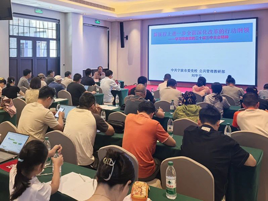 分班授課環節,中層干部班聚焦管理與育人,寧波出版社社長袁志堅傳授突發事件應對和網絡輿情引導策略,寧波第二技師學院副院長吳旭亞分享三全育人典型學校建設管理經驗,探索黨建與思政融合路徑。紀檢干部班緊扣監督與創新,寧波市委黨校主任劉華安解讀中國式現代化與黨的二十屆三中全會精神,明確監督執紀的改革方向;寧波市委黨校副教授吳新林深入闡釋新時代意識形態工作的重要性,筑牢思想防線。