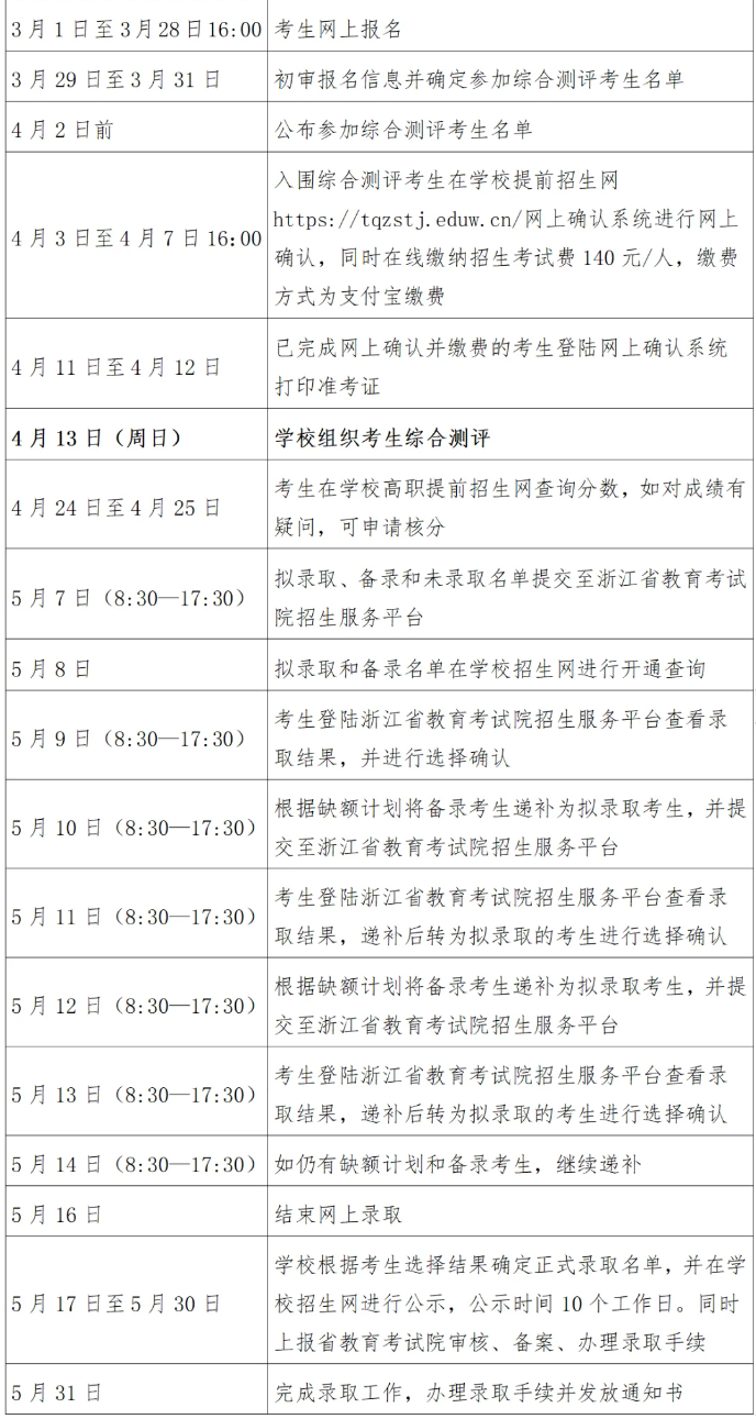 凡符合我校高職提前招生報名條件的考生于3月1日-3月28日16:00通過學校提前招生網(https://tqzstj.eduw.cn/)登錄,或直接登錄浙江省教育考試院高職提前招生服務平臺提交報名信息。