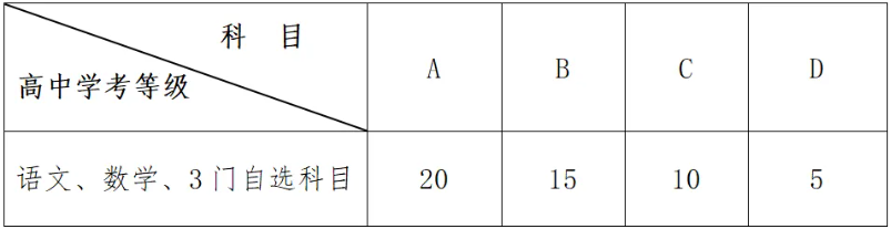 普高招生考生普通高中學業水平考試(學考)折算成績由2門必選科目+3門自選科目組成,五門科目成績進行折算,不同等級換算成相應分值,滿分為100分。必選科目為語文、數學,三門自選科目從外語、物理、技術、政治、歷史、地理、化學、生物中選擇學考等級最優的三門。高中學考等級以浙江省教育考試院提供的成績為準,學考等級是外省獲得的,須提供學籍所在省的省級機構出具或簽署意見的學業水平考試成績證書或證明(原件)。換算如下表: