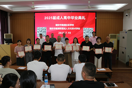 7月19日下午,瑞安市錦湖社區(qū)學校文化禮堂國歌嘹亮,莊重開啟2025屆首批成人高中畢業(yè)典禮。瑞安市錦湖街道社會事務辦副主任狄益斌、錦湖社區(qū)學校副校長(瑞安市職業(yè)中等專業(yè)教育集團學校總務處主任)謝統(tǒng)、教師代表陳震宇、2025屆成人高中班班主任徐定奎等領導嘉賓出席,與111名滿懷喜悅的畢業(yè)生齊聚一堂,共慶學業(yè)有成。典禮由常務副校長張再益主持,現場氛圍熱烈而莊重。