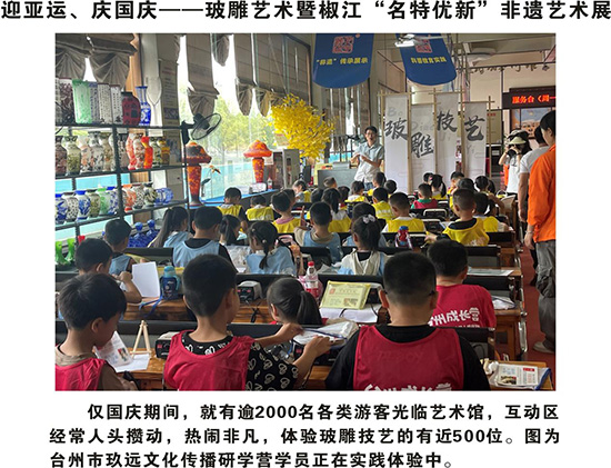 為豐富中小學(xué)生暑假生活,激發(fā)和培養(yǎng)廣大少年兒童傳承非物質(zhì)文化遺產(chǎn)的興趣,開辦“多彩暑期”、“‘玻文化’快樂學(xué)堂”等多項中小學(xué)夏令營、研學(xué)活動。2019年,玻璃藝術(shù)館獲批臺州市中小學(xué)生研學(xué)實踐教育基地,配備用于實訓(xùn)玻雕的機器設(shè)備60套,一次可供60人學(xué)習(xí)體驗玻璃雕,同時配備玻璃館的玻雕傳承人和椒江區(qū)葭沚成校的教師團隊及輔導(dǎo)員8名,每年舉辦的玻雕體驗培訓(xùn)及研學(xué)活動就有20多場,受益人數(shù)達2000多人次。同時,書院館精心設(shè)計了“玻璃雕刻研學(xué)路線”,路線注重模塊深度融合轉(zhuǎn)化打造集非遺科普、創(chuàng)意創(chuàng)新、生產(chǎn)制造、文化傳承、藝術(shù)展覽、旅游消費、人才培養(yǎng)、創(chuàng)業(yè)孵化等于一體的特色旅游路線,并制定特色體驗活動,打造出研習(xí)游、親子游等特色旅游項目。