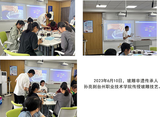 推進“玻雕文化”進校園活動。學(xué)玻雕技藝 做非遺傳人。“非遺玻雕”進校園,讓校園成為玻雕藝術(shù)保護與傳承體系中不可或缺的重要場所。“玻雕文化”進校園活動有助于學(xué)生認識非遺、學(xué)習(xí)非遺,保護非遺,推進玻雕非遺發(fā)揚光大,促進了全民終身學(xué)習(xí)體系的完善和提高。同時,“玻雕文化”進校園活動能培養(yǎng)學(xué)生動手制作創(chuàng)新的能力,從小培養(yǎng)他們的大國工匠精神。實施近十年來,已在學(xué)院路小學(xué)、文淵小學(xué)、華師大臺州學(xué)校、椒江二職、職業(yè)中專、臺州職業(yè)技術(shù)學(xué)院等學(xué)校創(chuàng)建了“非遺”社團,培訓(xùn)學(xué)生2000多人次。“玻雕文化”的學(xué)習(xí)和傳承,使學(xué)生了解了非遺文化,在繼承優(yōu)良傳統(tǒng)文化的基礎(chǔ)上培養(yǎng)了學(xué)生對“非物質(zhì)文化遺產(chǎn)”傳承與保護的興趣,形成具有鮮明特色的校園文化,為廣大師生創(chuàng)建優(yōu)良人文環(huán)境與和諧的發(fā)展氛圍,豐富學(xué)生對藝術(shù)品的鑒賞知識出了一份力。