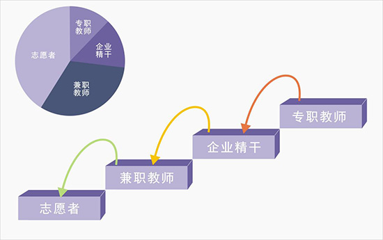 學校專職教師具備豐富的洗衣師理論知識和較強的操作技能水平,同時還具有一定的市場(需求)調研、分析和運營連鎖知識儲備,不但能夠滿足培訓需要,還具備培養兼職教師和志愿者的能力,以此類推,建立“專職教師—企業精干—兼職教師—志愿者”梯度指導,鏈式提升機制,制定了旨在促進教師專業化發展的反映教師職業道德教育觀念、教育教學及管理能力等內容的業績考核辦法。學校教師隊伍具有大專以上學歷達100%,中級及以上職稱教師占到75%。