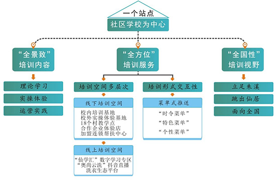 全景式:一是“全景致”培訓內容:涵蓋理論學習,實操體驗,運營實踐等從學習到實踐到運營一整套培訓內容。解決不會學問題。二是“全方位”培訓服務:1.培訓空間多層次(線下培訓空間包括校內培訓基地、校外實操體驗基地、18個村教學點,合作企業體驗店,加盟連鎖幫扶中心。線上培訓空間包括浙里辦“仙學匯”數字學習專區、“奧尚云洗”抖音直播、洗衣生態平臺等)2.培訓形式交互性(菜單式推送:“時令菜單”、“個性菜單”、“特色菜單”;雙選式擇課:我推—你選;你點—我送)。解決不便學與不愿學問題。三是“全國性”培訓視野:立足朱溪、跳出仙居、面向全國。