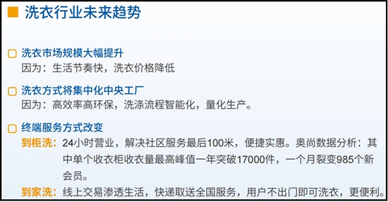 (二)淘汰落后工藝,開發洗護生態平臺。傳統門店從業者基本以技術型人才為主,對營銷軟件工具認識相對較低。通過與臺州市奧尚科技有限公司結對合作,從運營技術管理上全面培訓指點學員。開發洗護生態平臺,實現平臺下的同業和異業商戶互相合作,各自獨立經營,財務獨立,同時可以共享C端客戶資源,運營上大大降低了獲客成本。為行業帶來最大的創新亮點是為全國傳統洗護門店低門檻進入轉型互聯網化,基于奧尚平臺運營,為傳統洗護門店收發管理,24小時智能收發柜,線上到家快遞取送洗衣服務,洗衣工廠管理系統和門店,智能柜,合作門店,產品商城以及線上運營公司無縫對接。