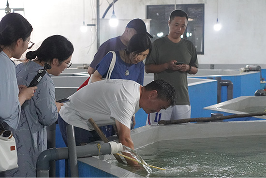 碧水育銀鱗,唇魚點水富。7月20日,實踐團輾轉(zhuǎn)至遂昌縣黃沙腰鎮(zhèn)探訪光唇魚養(yǎng)殖基地。遂昌九龍茂源石斑魚養(yǎng)殖專業(yè)合作社羅軍董事長帶領(lǐng)成員深入光唇魚、軍魚、香魚等多種淡水魚類循環(huán)水養(yǎng)殖場。當前基地內(nèi)建有23個魚塘,配備有保溫燈、紫外線、臭氧等設備。育苗培育池深度精確到厘米,引進智能溫控系統(tǒng)等專業(yè)孵化設施嚴格調(diào)控水質(zhì),精準管理光唇魚生長環(huán)境更加接近野生狀態(tài),確保魚苗健康生長。黃沙腰鎮(zhèn)黨委委員鐘菊梅介紹,合作社盤活40畝閑置土地資源,預計年產(chǎn)值超過100萬元,讓村民真正實現(xiàn)在家門口就業(yè),淡水魚養(yǎng)殖成為富民活水。同行隨訪的趙波副教授針對負責人羅軍提及的仿野生養(yǎng)殖光唇魚面臨的“卵甲藻病害”“生長周期長效益低”“洗澡魚”等痛點,提出“篩選強抗病親本魚苗”“集中小分散實現(xiàn)規(guī)模化養(yǎng)殖”“拓展上下游產(chǎn)業(yè)”“溯源編碼”等建設意見。