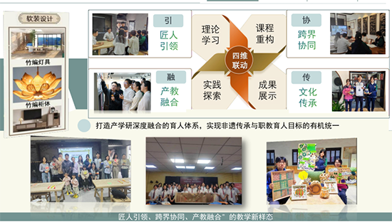 建筑裝飾攜手藝術(shù)設(shè)計(jì)專業(yè)組,以“跨界學(xué)習(xí)”為核心理念,聚焦于《建筑裝飾設(shè)計(jì)綜合實(shí)訓(xùn)》課程中的“非遺新生”項(xiàng)目開(kāi)展教學(xué)創(chuàng)新與實(shí)踐,通過(guò)“理論學(xué)習(xí)—課程重構(gòu)—實(shí)踐探索—成果展示”的四維聯(lián)動(dòng),形成 “匠人引領(lǐng)、跨界協(xié)同、產(chǎn)教融合” 的教學(xué)新樣態(tài)。