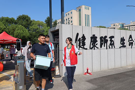 早上七時的校園,已有了忙碌的身影:校領導統籌安排,全校老師與黨員干部整裝待發,各項準備工作就緒。校門口,志愿者和老師們忙著幫新生搬運行李,不過片刻,汗水已浸濕了衣領,臉上滿是辛勞卻依舊熱情的模樣。