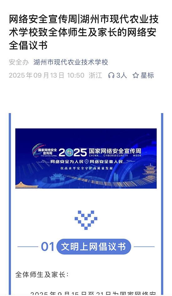9月15日至9月21日是國家網絡安全宣傳周。為進一步提高全校師生的網絡安全意識,普及網絡安全知識和技能,推動校園網絡安全建設,湖州市現代農業技術學校開展了形式多樣的網絡安全周校園日主題教育活動,為全校師生營造安全、健康、文明、和諧的校園網絡環境。