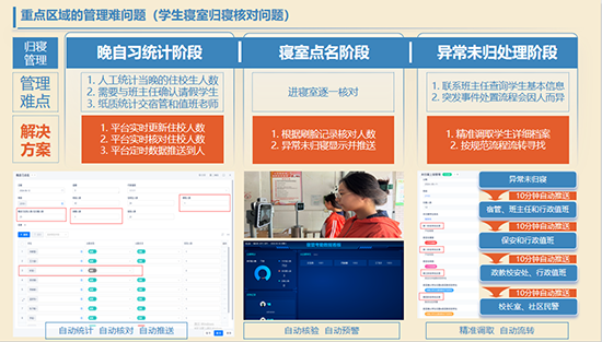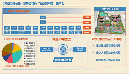 學校通過智慧校園平臺,打通 “氚云”“釘釘”“魔點”三大平臺的數據壁壘,搭建起智能化協同橋梁,實現精準智能預警:學生超時未歸信息會自動推送至社區民警;心理測評系統對 “三類預警學生” 進行實時分級告警,高危信息可直接同步至定點醫院,形成完整的風險防控閉環。