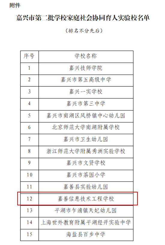 近日,嘉興市教育局公布第二批學校家庭社會協同育人實驗校名單,嘉善信息技術工程學校《探索“四共建二融合一橋梁” 家校社協同育人新生態:陽光成長指導中心賦能學生全面發展》的優秀實踐案例成功入選。