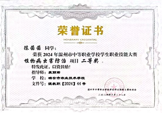 曾獲獎項:2024年浙江省植物病蟲害防治二等獎,國家獎學(xué)金,多次獲得校級獎學(xué)金,軍訓(xùn)標(biāo)兵,校級藝術(shù)節(jié)硬筆書法二等獎