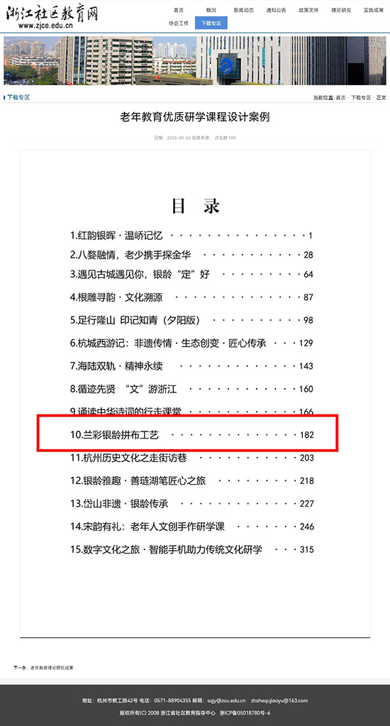 賦能銀發經濟,助力文化共富。學校積極推動拼布作品走向市場,通過電商運營培訓、直播帶貨實踐等方式,幫助學員將作品轉化為經濟收益。許多銀發學員通過線上平臺銷售手工拼布包、家居飾品等,實現了“老有所為、老有所獲”,為當地銀發經濟發展注入活力。2024年7月,學校打造的“蘭彩拼布共富工坊”被評為紹興市終身學習品牌;2025年7月,課程衍生項目《“布”言“布”語話非遺》再獲此殊榮,彰顯了拼布培訓在社區教育與文化傳承中的雙重價值。