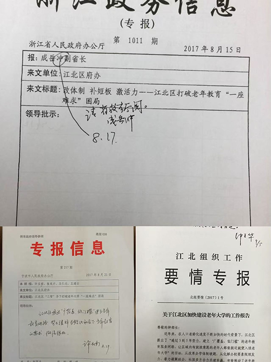 目前,浙江老年大學江北學院獲評浙江省優質示范老年大學,慈城鎮老 年學校、甬江街道老年學校獲評省優質示范老年學堂,鹽倉社區老年學堂等5 個教學點獲評省首批村居老年教育示范點。全區8個街道老年學校有5個獲評寧 波市標準化老年學校。江北區社區教育學院獲批全國“區域終身學習發展共同體”項目實驗單位,江北學院的《“樂學江北”老年品質生活課程》,莊橋街道老年分校的《博雅老年教育課程》等獲市終身教育品牌項目。《需求幅度理論視閾下老年教育課程體系的檢視與構建———以國家開放大學老年開放大學 為例》獲2021年浙江省社區教育優秀科研成果一等獎。近年來,國家開放大學老年學院院長溫書宇、浙江開放大學黨委書記徐公芳、校長張建國先后來江北考察老年教育,教育部教育發展研究中心、中國成人教育協會以及省內外老年 教育同仁多批次前來考察交流。老年教育的江北模式多次被中國新聞網、人民 網等主流媒體報道,產生了積極的社會反響,集知名度、滿意度、美譽度為一 體的老年教育已成為建設“和美江北 品質之城”一張靚麗的名片。
