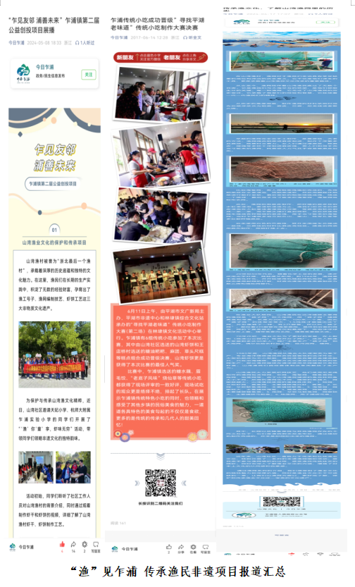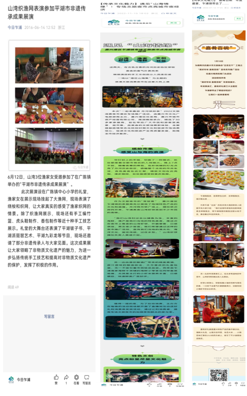 9.報道頗多:山灣非物質文化遺產在今日乍浦的微信上擁有眾多的報道,如:“五彩嘉興行 魅力港區 五彩乍浦”——織漁網,唱漁工號子,感受獨特的海洋文化,山灣織漁網表演參加平湖市非遺傳承成果展演,走進校園“漁業文化 鄉土情懷”大講堂活動,遇見“山海情緣”專場文旅夜市點亮城市夜經濟,“漁”你“童”享,蝦味無窮”做蝦餅活動等等共20余篇報道。