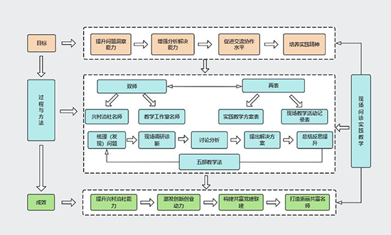 為了提升領雁學員的實戰(zhàn)能力,學校探索開展現場把脈問診式教學,現場問診實踐教學活動采用“雙師+兩表+五步教學法”,教學工作室名師與興村治社實踐導師參與討論教學方案表的制定,以梳理(發(fā)現)問題、現場調研診斷、討論分析、提出解決方案、總結反思提升五步教學法開展。該教學方法以農民大學生自己鄉(xiāng)村治理現實問題為導向,組織學生對提出的問題進行討論和分析,共同探討解決方向,促使學生將所學知識學以致用,有效提高農民大學生實踐治理能力和創(chuàng)新創(chuàng)業(yè)能力。