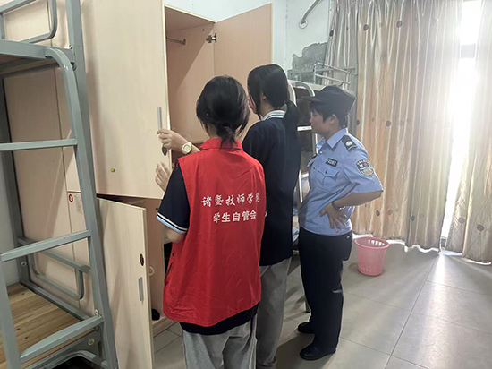 “請班主任整好隊”“各班按次序等待檢查”“請把皮箱、衣柜打開”……10月13日下午,諸暨技師學院安管處聯合諸暨市城東派出所對學生寢室開展了管制刀具等違禁物品突擊檢查。
