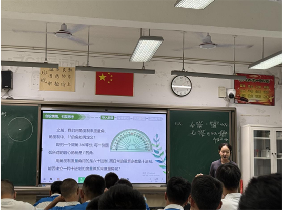 活動伊始,溫州市龍灣區職業技術學校王建子老師帶來了一節題為《弧度制》的公開課。王老師以“為何要為圓量身定制一把尺子”為切入點,引導學生從生活實際出發,思考角度制的局限,自然引入弧度制的概念。課堂上,她巧妙運用幾何畫板實時演示弧長與半徑的關系,幫助學生直觀理解“弧度”的本質;學生通過繩子與圓規動手操作,親身體驗“1弧度”角的形成過程,深化對“弧度是弧長與半徑比值”這一核心概念的理解。