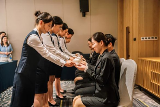 2025級(jí)新生代表身著專業(yè)制服,向企業(yè)師傅恭敬奉茶,一杯杯熱茶承載著對(duì)前輩的敬意,也象征著同學(xué)們開啟了職業(yè)探索的新旅程。