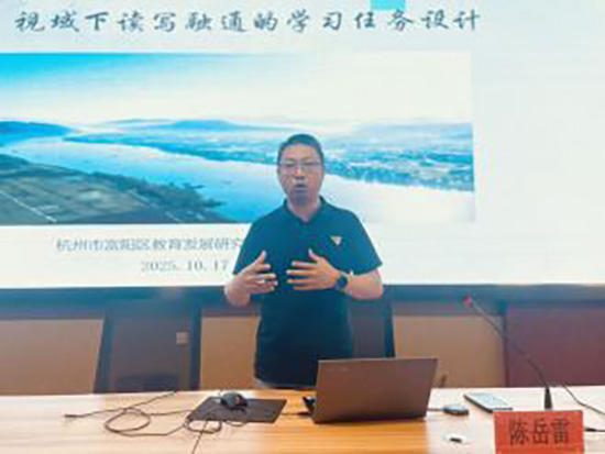 富陽區(qū)教育發(fā)展研究中心陳岳雷老師帶來《單元視域下讀寫融通的學(xué)習(xí)任務(wù)設(shè)計》講座。他深入解析“單元”“讀寫融通”與“學(xué)習(xí)任務(wù)”等核心概念,直面寫作教學(xué)現(xiàn)實困境,結(jié)合課例闡釋讀寫結(jié)合的有效路徑,鼓勵教師引導(dǎo)學(xué)生觀察生活、深度閱讀,激發(fā)表達(dá)與創(chuàng)作熱情。