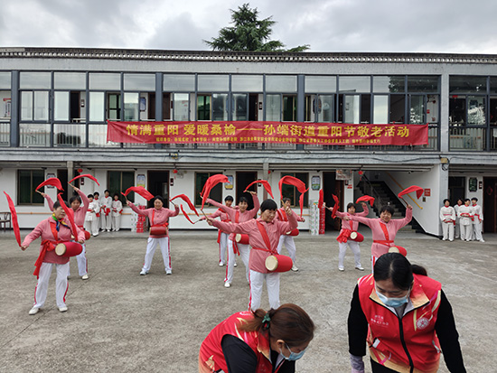 活動在孫端老年學校學員的腰鼓表演《中華全家福》中拉開帷幕。歡快的鼓點、鮮艷的服飾,再加上老年學員們熱情洋溢的表演,立刻讓在場的老人們沉浸在了節日的喜慶氛圍中。