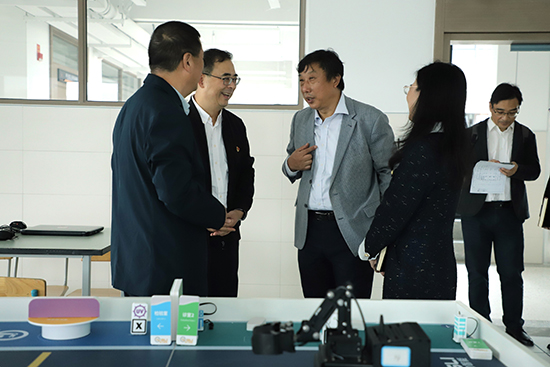 在鄞州職高黨委書記盧科與校長張武劍的陪同下,張慧波書記一行實地考察了校園,先后參觀了學生寢室、體育館、食堂、圖書館等場所,并深入智能制造、交通運維、供應(yīng)鏈管理、數(shù)智藝術(shù)四大專業(yè)群的現(xiàn)代化實訓基地,詳細了解學校硬件設(shè)施、教學環(huán)境和實訓室建設(shè)情況。