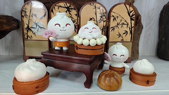 在杭州市龍塢茶鎮(zhèn)茶奧會現(xiàn)場,組織了浙江省中職學校特色專業(yè)非遺教學成果展。學校選送的多件木雕作品陳列有序,備受好評。其中,姿態(tài)飄逸的人物根雕巧妙地保留了木材的天然紋理和特性,展現(xiàn)出嵊州根雕獨特的藝術價值;與之相比,學生作品“嵊小籠”顏色鮮亮,憨態(tài)可掬,以年輕人更活力、時尚的方式展示嵊州的美食文化和特色產(chǎn)業(yè),與自然古樸的傳統(tǒng)根雕相映成趣;精巧的骨木鑲嵌作品將骨片的溫潤和木片的深沉巧妙結(jié)合,打造出柔和而雅致的藝術效果。