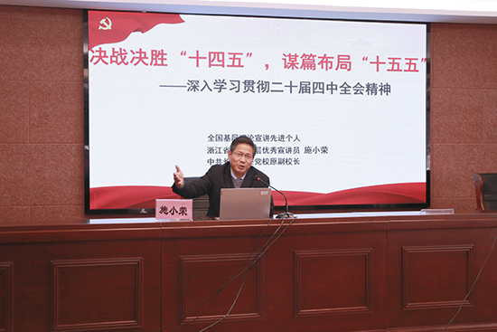 本次黨課特邀全國基層理論宣講先進個人、浙江省十大優秀基層宣講員施小榮老師作專題輔導。施老師以“決戰決勝‘十四五’,謀篇布局‘十五五’”為題,系統闡述了黨的二十屆四中全會的重大理論貢獻和現實指導意義,并分享了自己學習全會公報的深刻感悟與獨到見解。他的講座既有深厚的理論功底,又緊扣時代發展脈搏,同時語言生動、案例鮮活,贏得了在場黨員的陣陣掌聲。大家普遍認為,施老師的講座如同一場“及時雨”,對全面、準確、深入地理解全會精神具有重要的指導作用。