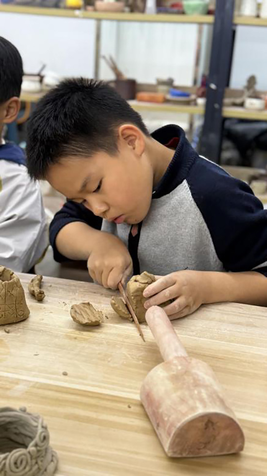 本次托管活動內容豐富,特色鮮明,充分利用了學校的專業優勢和資源。在系列活動中,孩子們先后體驗了陶藝制作、扎染工藝、竹編藝術以及科創項目等多種特色課程。他們不僅在工藝美術老師的指導下,與泥土對話,感受拉坯塑形的樂趣與匠人精神;也在服裝組老師的帶領下,親手扎染制作出獨一無二的團扇,領略傳統技藝的奇妙?;顒舆€特邀竹編工藝大師斯浙鵬親臨指導,讓小朋友們在動手實踐中加深對傳統文化的認知。此外,科創名師沈亞東老師和創客團隊的同學們為小朋友們開啟了一場“科創巡游”,引領孩子們走進科技的世界,感受智能制造、電腦編程和AI機器人的無限魅力,激發了他們的探索與創新熱情。系列活動的收官之作“操場長卷拓畫”,則讓孩子們在陽光下用樹葉和日常物品揮灑創意,長長的畫布上,拓印的不僅是樹葉的形狀,更是孩子們對這個秋天最鮮活的記憶,為秋假畫上了圓滿的句號。